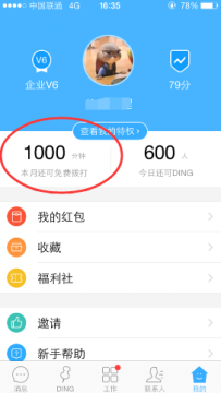 打开钉钉客户端后,在我的功能中,即可看到本月还可免费拨打多少分钟的电话。小编已达到每月1000分钟的免费通话特权哦!如果你没有1000分钟的话,用完了该怎么办呢?
