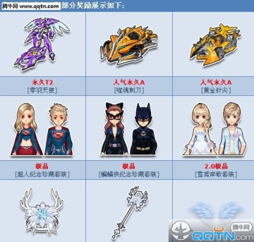 开启100%获得角色经验卡+800,且有机会获得永久T2【零羽天使】、人气永久A车【噬魂剃刀】/【黄金针尖】、极品 【超人纪念珍藏套装】/【蝙蝠侠纪念珍藏套装】、2.0极品【雪鸢岸歌套装】、极品【雪语圣铃戒指】或其他奖励之一!