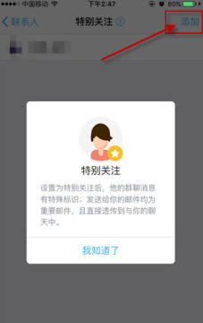 3、进入到特别关注,可以在右上角看到【添加】字样,这里可以添加新的特别关注。