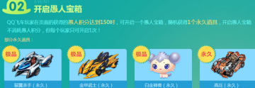 QQ飞车玩家在页面的获得的愚人积分达到150时,可开启一个愚人宝箱,随机获得1个永久道具,开启愚人宝箱不消耗愚人积分,但每个玩家只可开启1次!