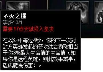 不灭之握:战斗中每4秒,你的下一次对敌方英雄的普通攻击就会偷取相当于你3%最大生命值的生命值。(远程英雄效果减半,造成魔法伤害)