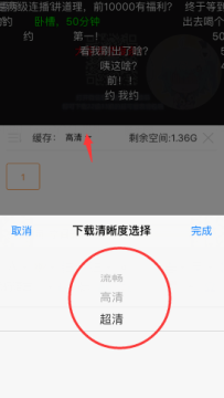 2、点击缓存后,在视频下方会显示清晰度,然后选择自己想要的即可,小编选择的超清,然后点击完成;