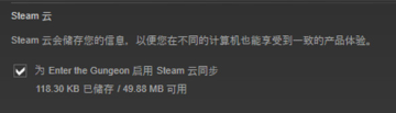 其次,并不是挺进地牢这款游戏不能存档,只不过像这样的游戏,都是采用的云同步云存档的机制。通俗点说就和网络游戏一样,使用的网络即时存档。如果你是正版steam玩家,就能看到这个功能。如图所示:
