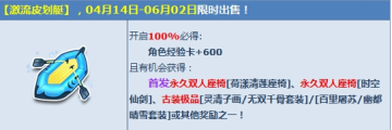 体验【激流皮划艇】,100%必得角色经验卡+600,有机会得首发永久双人座椅【荷漾清莲座椅】、永久双人座椅【时空仙剑】、、古装极品【灵清子画/无双千骨套装】/【百里屠苏/幽都晴雪套装】或其他奖励之一!