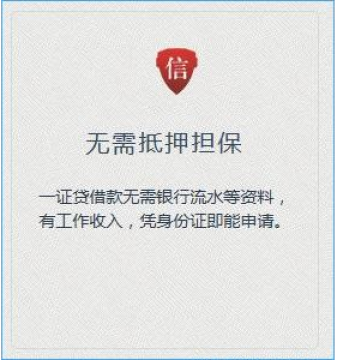 一证贷是小额大联盟旗下微信端产品,一证贷打出了这样的口号,一个身份证就能贷,简单来说,申请一证贷借款人不需要提供银行流水等资料,需要有工作收入,凭身份证即能申请。