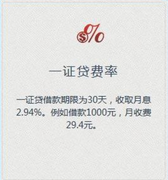 一证贷借款期限为30天,收取每天0.3%手续费。例如借款1000元,每天收费3元。在成功借款之后,借款人可以通过电脑或是支付宝还款,也可以在银行的ATM机上办理还款。