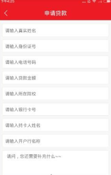 2、在贷款界面,输入真实姓名,身份证号,电话号码,贷款金额,所在院校,银行卡,持卡姓名,开户名称,填写信息后点击立即申请按钮就可以的哟~
