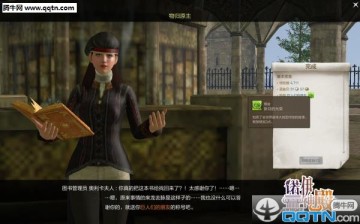 图书管理员奥利卡夫人在NPC列表是找不到的,但是不要急,我们就顺着大道拾级而上,在图书馆门口的水池边就可以看到她了,当我们靠近后奥利卡夫人头顶会亮起黄色叹号,代表我们可以交付任务,并接取下一阶段的任务——“书非借不能读也”。