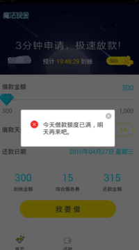 当魔法现金显示今天借款额度已满,明天再来吧,就表示你今天不能进行借款申请了,因为魔法现金每天借出来的钱是有一个额度限制的,所以比如额度是10万元,那么就只支持100个人借1000元,在早上十点至晚上八点之间,如果已经有100个人没人借走了1000元,再进行申请的用户就会收到借款额度已满的提示,所以你需要在第二天进行申请。