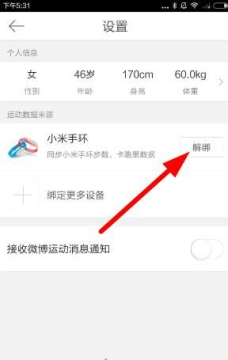 2、在设置界面,点击小米手环解绑按钮,解绑运动设备后就不用再记录你的运动数据的哟·
