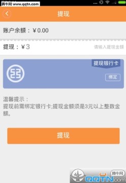 你需要绑定银行卡,并且提现金额在3元以上整数,点击提现按钮就可以了!