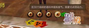 点击“J”键是消耗30个捣碎的香料提炼香气。捣碎的香料通过使用青铜雕刀加工薄荷向日葵等香辛料获得。