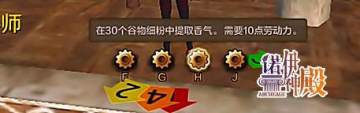 点击“H”键是消耗30个谷物细粉提炼香气。谷物细粉通过使用青铜雕刀加工大米玉米等谷物获得。
