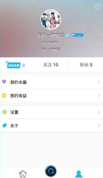 3、在我的页面,用户可以查询我的水晶,我的收益,同时查看关注的主播信息及粉丝。