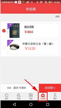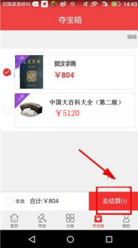 1)打开京东夺宝,点击【夺宝箱】,勾选好自己需要的商品点击【去结算】;(如下图)