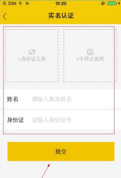 2、在实名认证页面中,上传身份证正面、手持正面照,输入姓名和身份证号,然后点击提交即可。