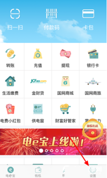 一、首先在手机中打开并登录电e宝,在其主界面切换至【设置】选项卡,如图所示。