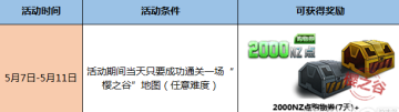 活动期间(5月7日-5月11日)当天只要成功通关一场“樱之谷”地图(任意难度)即可获得庆典福利礼包,内含:2000NZ点购物券(7天)一张/4个樱之谷普通宝箱/2个雷藏专属武器箱(宝箱为樱之谷成功通关的掉落宝箱,一定几率可开出新图专属永久武器)。完成通关任务后,奖励将自动发放至个人仓库,但每个Q号仅限获得一次。