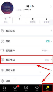 1、打开一起秀直播app,在“我的”中选择“我的收益”按钮;
