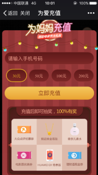 微信客户端母亲节为爱充值活动 充话费抽优惠券实物