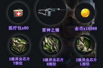 2元购20钻,可抽取雷神之锤、医疗包*80、金币*18888、2级异虫芯片T部位、2级异虫芯片H部位、2级异虫芯片L部位
