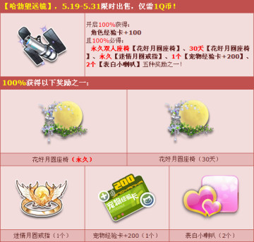 玩家们在活动期间打开【哈勃望远镜】,必得角色经验卡+100,还额外必得永久双人座椅【花好月圆座椅】、30天【花好月圆座椅】、【迷情月圆戒指】、【宠物经验卡+200】、【表白小喇叭】五种奖励之一!