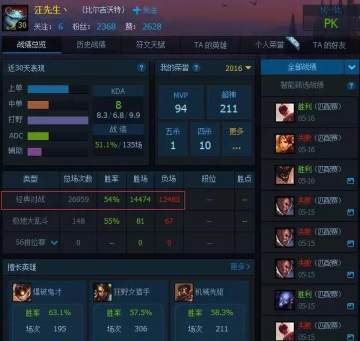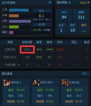 先看看他比尔吉沃特区游戏场数,26931场游戏,全是匹配局,从中可以看出胜率还是比较高的,2万多场有着54%的胜率足以傲视群雄了。国服2011年9月22日公测,游戏开服至今有1700天左右,就算汪先生丶从开服的那一天开始玩LOL,每天玩儿16场游戏才会有今天的这个数据。
