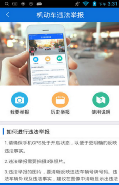 机动车违法举报页面显示,我要举报、历史举报、使用说明三个功能。页面上的如何进行违法举报显示,第一步为确保手机GPS处于开启状态,以便于更明确地反映违法事实。再有,违法举报需要拍摄3张照片。违法举报的图片、视频,要清晰反映违法车辆号牌号码、违法车辆外观及违法事实,建议在图中清晰显示出违法地点的标志性建筑。驾驶员在行车过程中要严格遵守交通法规,不得在驾驶过程中或其他妨碍交通安全的情况下拍照。页面上的文字还显示,鼓励参与实名举报违法行为,交管部门会保护举报人的个人隐私。