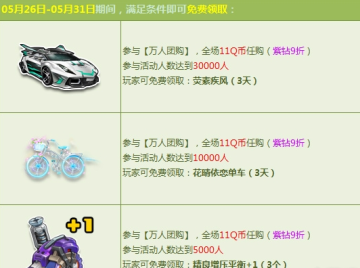 玩家打开【商城狂欢-万人团购】,全场所有商品11Q币任购(紫钻更有9折优惠)!当参与玩家达到一定人数时,还可免费领取极品道具哦!