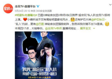 据悉这次直播将于5月26日17点在全民TV播出。