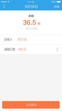2、在我的钱包中,可以看到自己的总收入,以及具体余额情况,你的收益明细都可以在钱包里进行查看,在最下方点击全部提现即可。