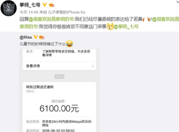 事情的起因很简单,就是因为Miss大小姐在微博晒出一张截图,并PO文:儿童节的时候我错过了什么!原来是若风在六一儿童节的凌晨给Miss转了6100块,然而Miss并没有收,于是这笔钱就自动退还了回去。有网友就这件事@了七号,调侃道:我觉得你爸爸肯定不同意这门亲事,而七号也随后做出了回应:我们已经尽量委婉的表达给了若鼻。于是网友就开始调侃若风了。