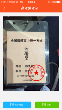 3、这个时候,你就可以看到高考监考证生成图片啦!保存到相册即可放松到朋友圈中哦!