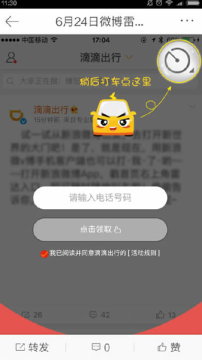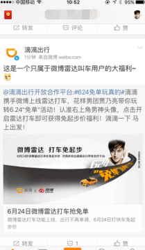 此外,在6月24日,微博还跟滴滴联合推出了微博打车免起步价功能,用户可通过优惠券来减免快车的部分费用。