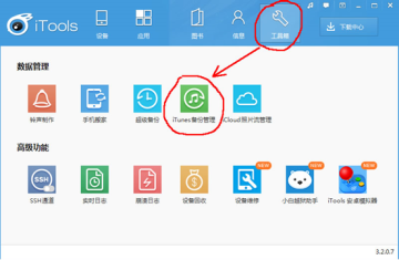 3,打开iTools软件,点击“工具箱”后,在下方的数据管理版块下点击“iTunes备份管理”。