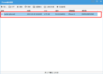 4,弹出窗口中可以看到所有备份在该电脑上的手机数据,因为小编只做过一次备份,所以只有一行数据,下面我们双击打开这一行备份数据。