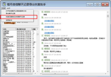 8,该微信号中与所有好友的聊天记录就在软件界面上一览无余了,我们接着点击“文件”“恢复已删除的微信聊天记录”菜单。