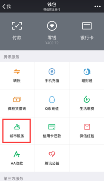 1、微信用户在我的钱包中,找到城市服务入口,如图: