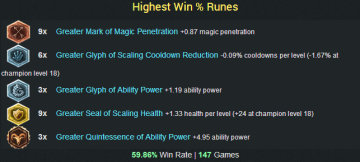 符文红色选择9个法穿,蓝色3个固定魔抗和6个成长减CD,黄色9个成长生命值,精华3个法强。