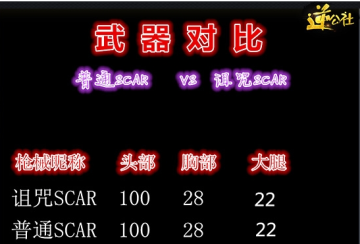 诅咒SCAR通过对比可发现,武器在外观上做了很大的文章,而弹道和伤害方面和普通SCAR并无太大差异,前置载弹量为35发。武器的具体来源为QQ浏览器专属获得。