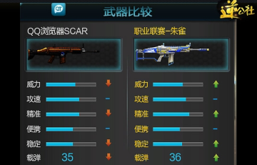 与SCAR-朱雀(职业联赛)进行对比,攻速和便携度毫无差异,威力稳定性等拥有小幅度的改变,载弹量方面拥有一颗之差。