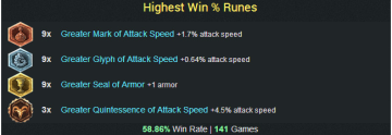 大嘴的攻速能在W的加成下可以突破上限,而且每次普攻都附有最大生命值的伤害。所以攻速越快大嘴收益越高。因为有了攻击距离的加成,在团战中很少敌方后排能轻易打到大嘴,雕文方面可以带上攻速。