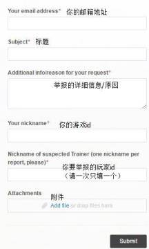 5.Nickname of suspected Trainer. (one nickname per report, please) – 你要举报的玩家id。(请一次只举报一个玩家。同时,4和5请务必不要填反。)