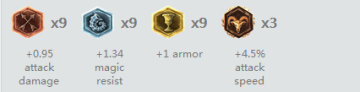 符文这里选择红色9个攻击力,蓝色9个固定魔抗,黄色9个固定护甲,精华3个攻速。