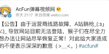 根据A站官微于发布公告表示“由于运营商线路故障,A站躺枪_(:з」∠)_ 导致网站目前无法登陆,猴子们在尽全力想办法让网站尽早恢复正常!对此给大家造成的不便表示深深的歉意 ( >﹏<。)”