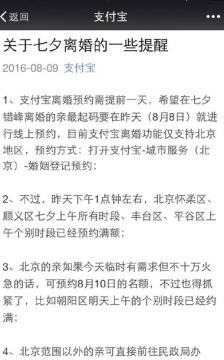 支付宝官方提示:离婚预约需要提前一天,尤其是在七夕这么有纪念意义的节日里离婚,更要提前一些。