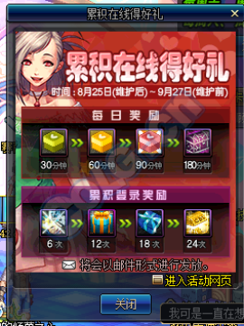 作者:腾牛小编 人气:0DNF8月25日更新后,新活动累积在线得好礼将和大家见面,活动的开启时间为8月25日至9月27日,玩家通过每天在线30分钟、60分钟、90分钟和180分钟都能够领取相应的奖励,同时累积登陆还能够获得额外的奖励。总的来说本次DNF体验服更新的这个活动还是蛮不错的,只需要简单的站街就能够拿到奖励。
