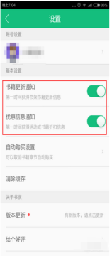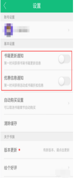 5.在设置界面,默认情况下“书籍更新通知”和“优惠信息通知”是开启的,点击关闭即可,如图所示: