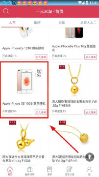 1、打开一元米淘软件,在首页我们就可以看到海量精美商品,小编这里以“iPhone SE手机”为例,点击“加入清单”按钮;