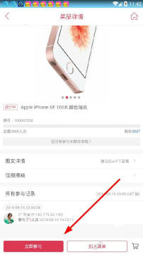 2、跳转至“奖品详情”页面之后我们可以看到本次抽奖的期号、图文详情、参与人数等等,最后点击下方“立即参与”就参与夺宝成功了哟!